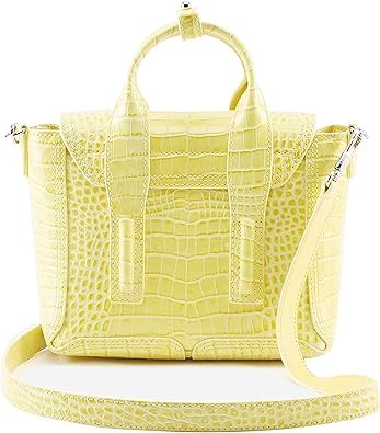 Pashli Mini satchel in stamped croc on calfskin leather with signature expandable side zip pleats and a push lock padlock closure. Interior card pocket.