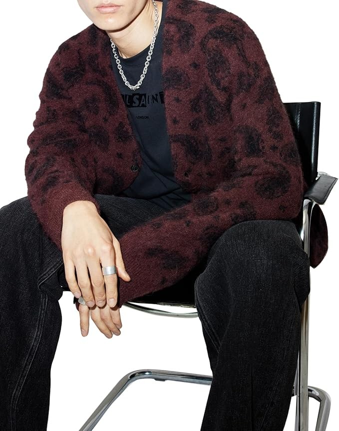 This cardigan comes in a soft red with a black Paisley jacquard. It has an interior face for decoration and two sticker bags on the front. A comfortable fluffy textured yarn gives this cardigan the feel of a shirt.