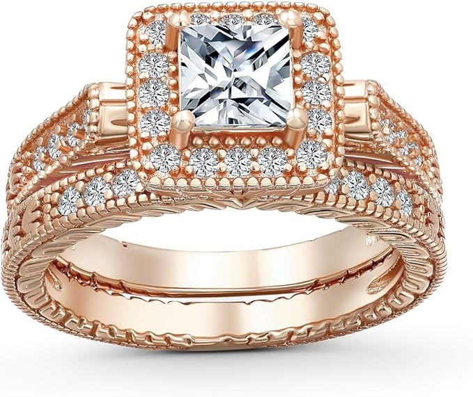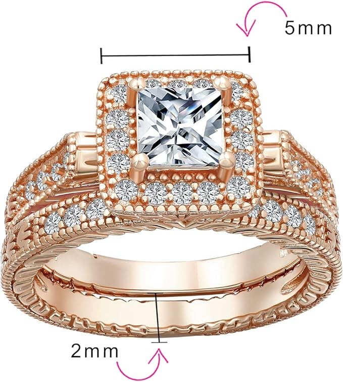 Bling Jewelry Rose 925 Sterling Silver Gold plated Sterling Silver Princess Cut CZ wedding ring set