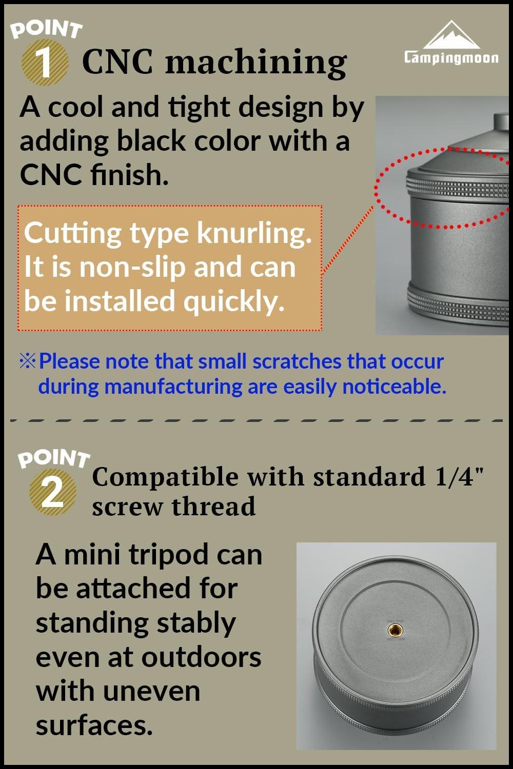 Compatible with standard 1/4" screw thread. A mini tripod can be attached for standing stably even at outdoors with uneven surfaces.