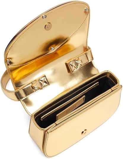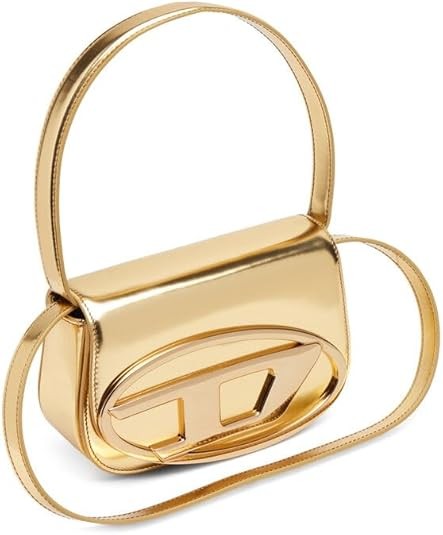 The electroplated oval D plaque on the flap—signature element of the style—matches the glossy, mirrored-leather construction.
