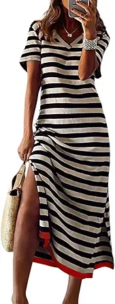 Dokotoo Summer Dress Casual Womens Fashion Short Sleeve Maxi Dress T Shirt Dress Striped Long Color Block Maxi Dress
