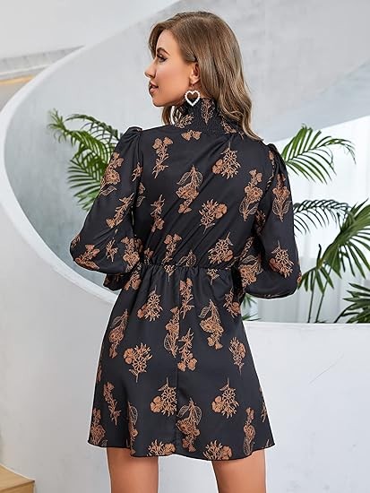 Floral print, stand collar, pleated collar, tie tie, long sleeve, high stretch waist, A-line flounce short dress