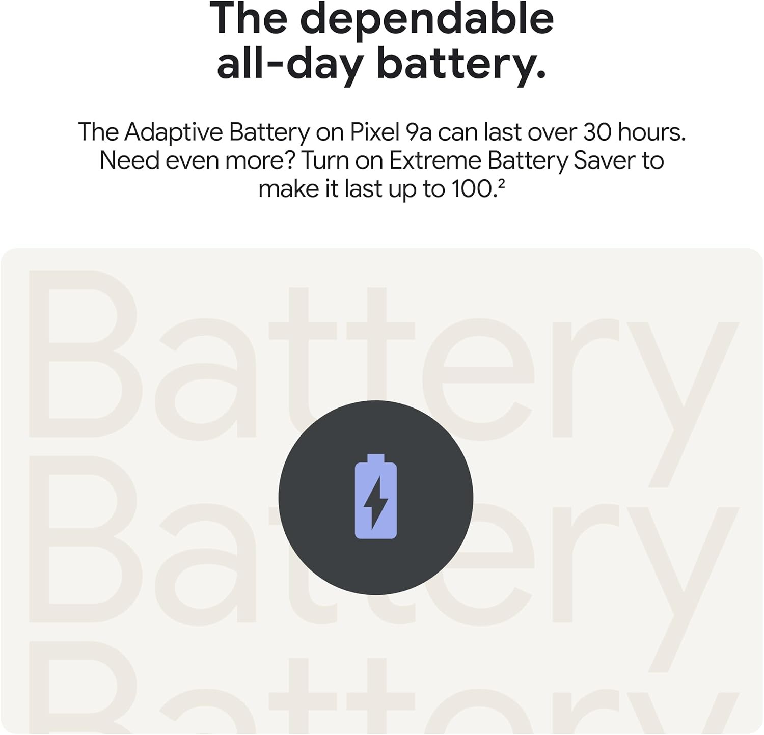 Google Pixel’s Adaptive Battery can last over 30 hours[2]; turn on Extreme Battery Saver and it can last up to 100 hours, so your phone has power when you need it most[2]