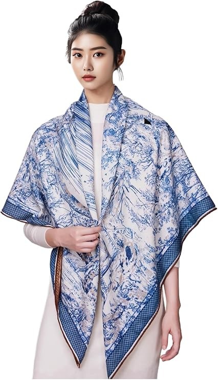 The scarf features intricate scenic prints on both sides, showcasing traditional architectural elements, serene gardens, and flowing water. One side is adorned with calming blue tones, while the other highlights warm earthy hues, offering a harmonious blend of artistry and sophistication. These detailed patterns make the scarf a timeless and artistic accessory.