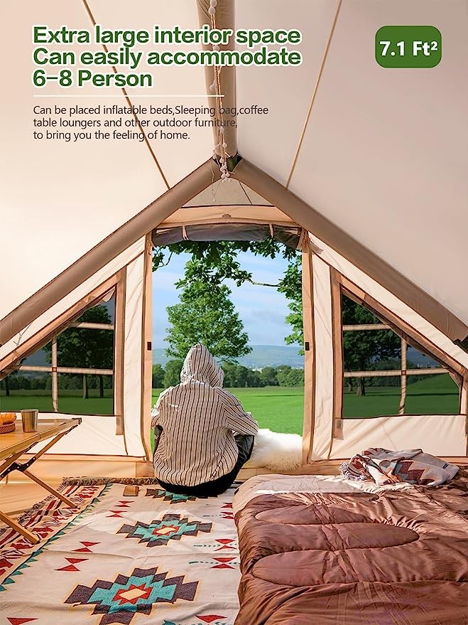 【EXCELLENT CRAFT】: inflatable tent has two mesh screen door and eight mesh screen window circulation ventilation; the top has a lanyard allows you to hang lights full of atmosphere, there are also storage bags can be placed cell phones, small objects; reinforced ground nails make the tent more solid, each door and window can be selected according to demand to play not open, very convenient.