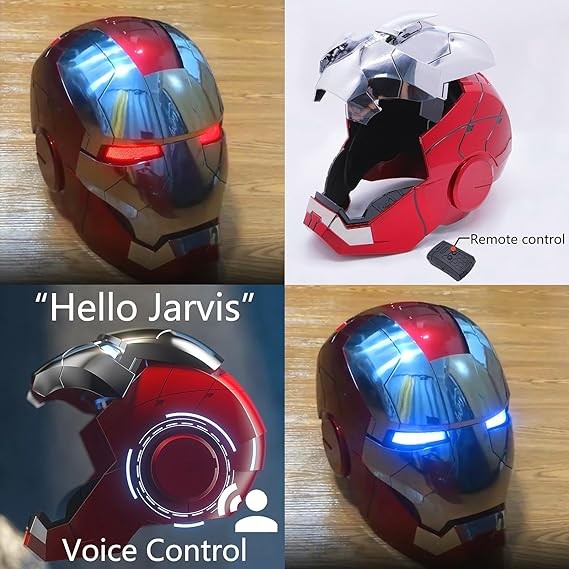 【Two Modes Can Be Switched Freely】:Suitable for head circumference up to 25 inches, you can control the light color of the eyes and the opening and closing of the mask by voice, eye lamp color can be switched between red and white. White light means the standard mode, red light means the battle mode; ''Jarvis'' follows your command and makes you a real superhero.no matter control, the interval between each operation should be more than two seconds, otherwise the reaction may be slow.
