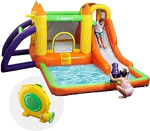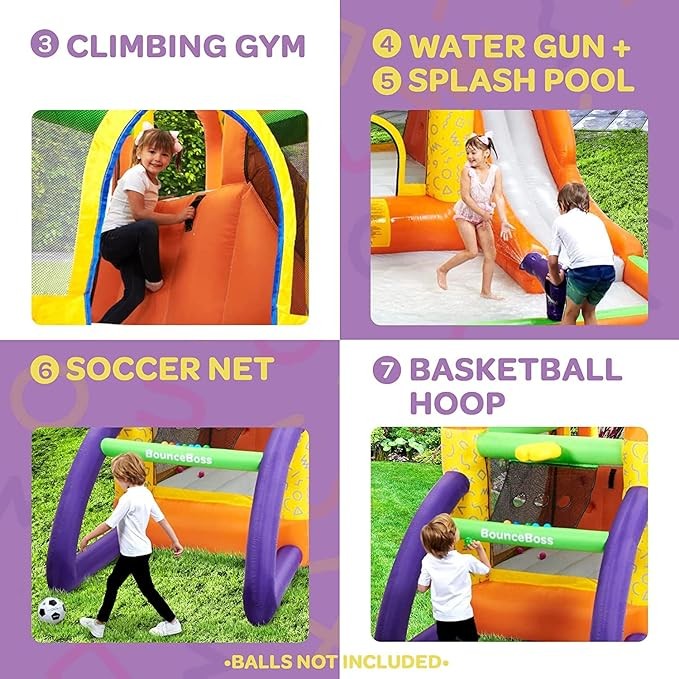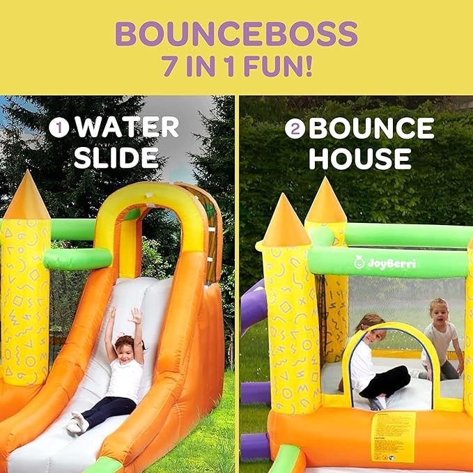 7 IN 1 FUN - With the bouncy castle, water slide, splash pool, water gun, soccer net, basketball hoop, and climbing gym, the JoyBerri Bounceboss will keep your kids joyfully entertained for hours on end!