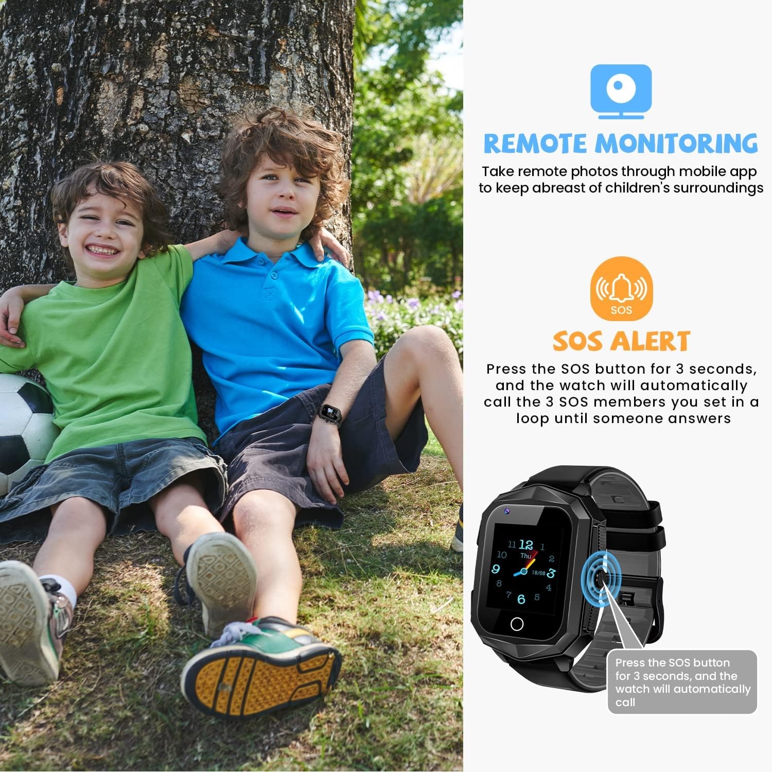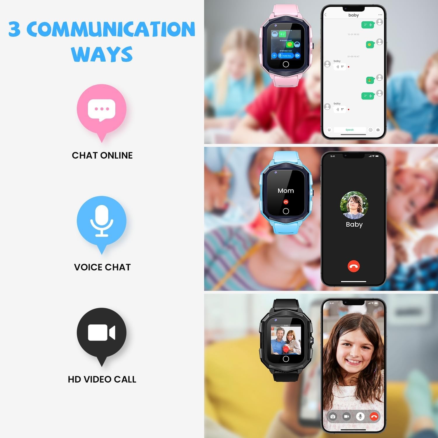 Stay connected - This mobile watch for kids is designed to protect and connect with kids. With two-way video call function, face-to-face video call with children anytime and anywhere. Kids can not only watch video/voice chat, but also send pictures/emoticons. Video and voice chat interactions make communication more fun and chat.