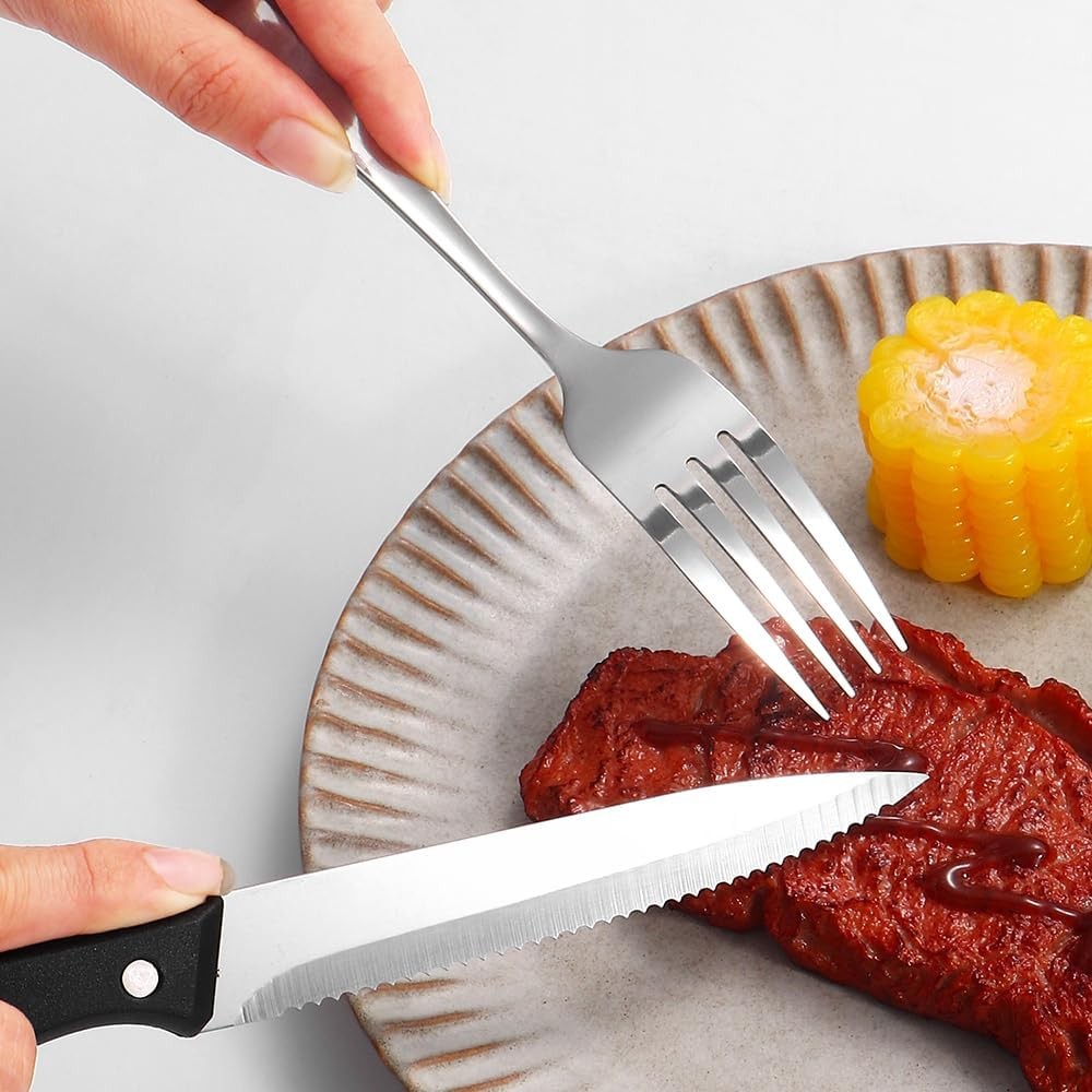 DECENT WEIGHT, DISHWASHER SAFE --- Made of thick food grade stainless steel, no bending or rusting, solid weight, they feel good in your hands. The steak knives are sharp and work well for thick cut meat or thick chicken breast. Perfect basic eating utensils set for everyday meals.