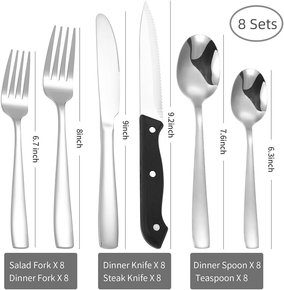 48 PCS FLATWARE SET FOR 8 --- Includes 8 steak knives, 8 dinner knives, 8 dinner forks, 8 salad forks, 8 dinner spoons and 8 teaspoons, complete kitchen essentials for home apartment restaurant. Great cutlery set for your large family gatherings.