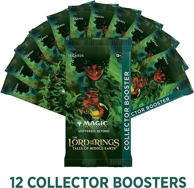 CONTENTS—12 The Lord of the Rings: Tales of Middle-earth Collector Boosters, with 15 MTG cards in each pack + 1 Traditional Foil Borderless Realms & Relics Box Topper card