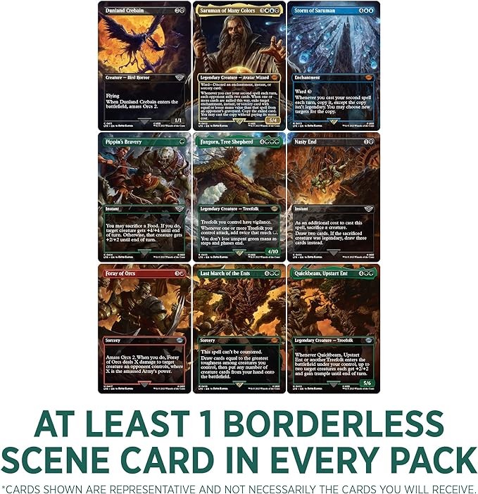 COLLECT BORDERLESS SCENE CARDS—Every Collector Booster contains at least 1 Scene card with Borderless art that’s one piece of a larger, multi-card scene; collect them all to piece together a full view of the most iconic moments from The Lord of the Rings