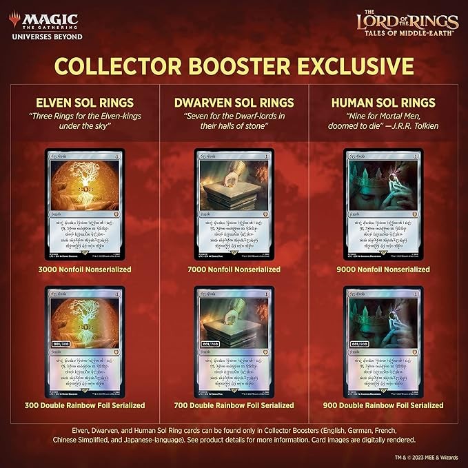 FIND YOUR OWN RING OF POWER—Collector Boosters are the only boosters that may include Serialized Elven, Dwarven, or Human Sol Ring cards. These cards have the same play mechanics as their non-serialized versions. The Serialized 1 of 1 Ring was originally in an English Collector Booster but was found on June 30, 2023.