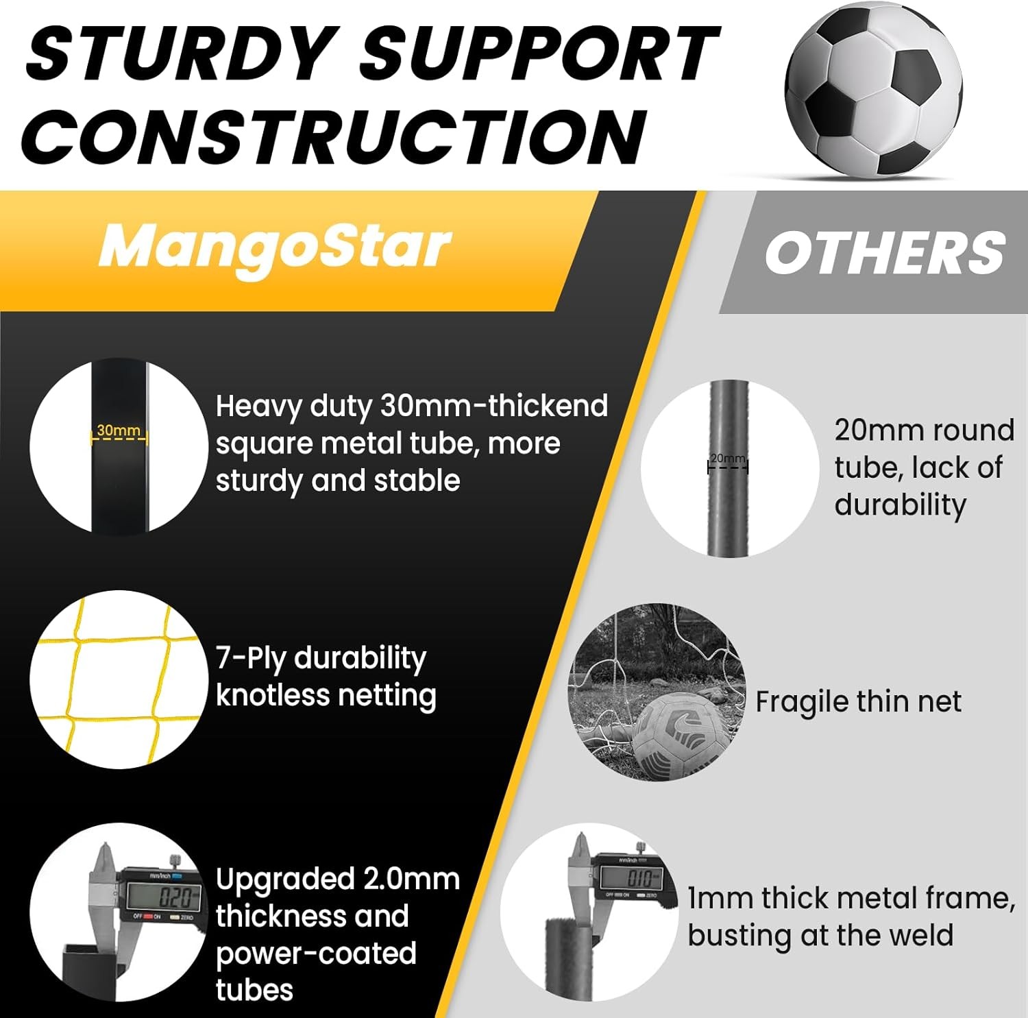 Unique and Stable Structure: The MangoStar soccer goal is supported by a 2mm thick heavy-duty square collapsible telescopic metal base with a rust-proof black paint coating, ensuring resistance to scratches and corrosion. It can be stretched to 12 ft, and its curved design ensures stability on rough ground. Flexible fiberglass poles provide additional support, and it comes with 4 ground stakes to enhance stability on grass. This soccer goal is suitable for all-weather conditions