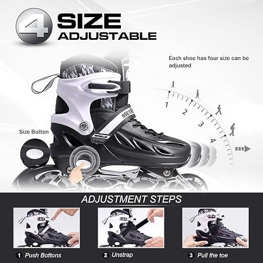 【Adjustable Inline Skates】Our inline skates come in 4 different unisex sizes are perfet for growing feet, Small for little kid(11j-1)/Medium for big kids(1-4)/Large for youth(4-7)/XL for adults(7-10), each size is adjustable.(Please make sure to choose the correct size by checking the size chart)Use the button to change the length of the boots before wearing, you will find it very easy to wear and adjust. Everyone can get a perfect size suits them, and kids and youth can use it for many years.