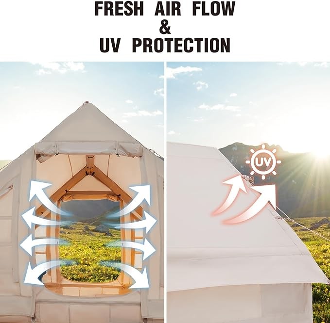 【Comprehensive Protection】 Crafted from high-quality 300D PU Oxford fabric, the blow up glamping tent strikes the perfect balance between lightweight and durability. With an outstanding 3000mm waterproof rating, UV resistance, and the generous rain covers over the two side windows, you'll always enjoy a dry haven, even in the ever-changing weather, ensuring dependable protection.