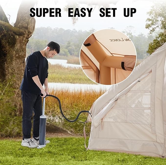 【Quick and Easy Setup】 Our inflatable tent comes with an integrated TPU air pump. Just locate the camping tent's valve, set up the air pump, and you'll have it pitched in a mere 10 minutes. The self-supporting inflatable structure, along with the triangular roof design, adds an extra layer of stability to the tent's structure. No more hassle – spend more time immersed in the joy of camping.