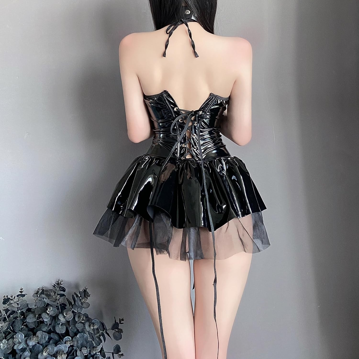 ?PACKAGE INCLUDES: Dresses+ neck rings+ thongs.Erotic lingerie shiny PU devil wings see-through short skirt uniform dress COSPLAY suit