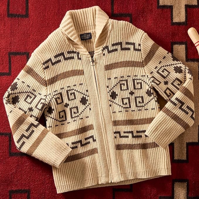 Pendelton is bringing back this men's cardigan sweater in response to popular demand! "Big Lebowski," with fans calling for a return. Now it's going back to the last color and detail. Made of comfortable lamb wool. Available in tan/brown. The perfect novelty layer for fall and winter.
