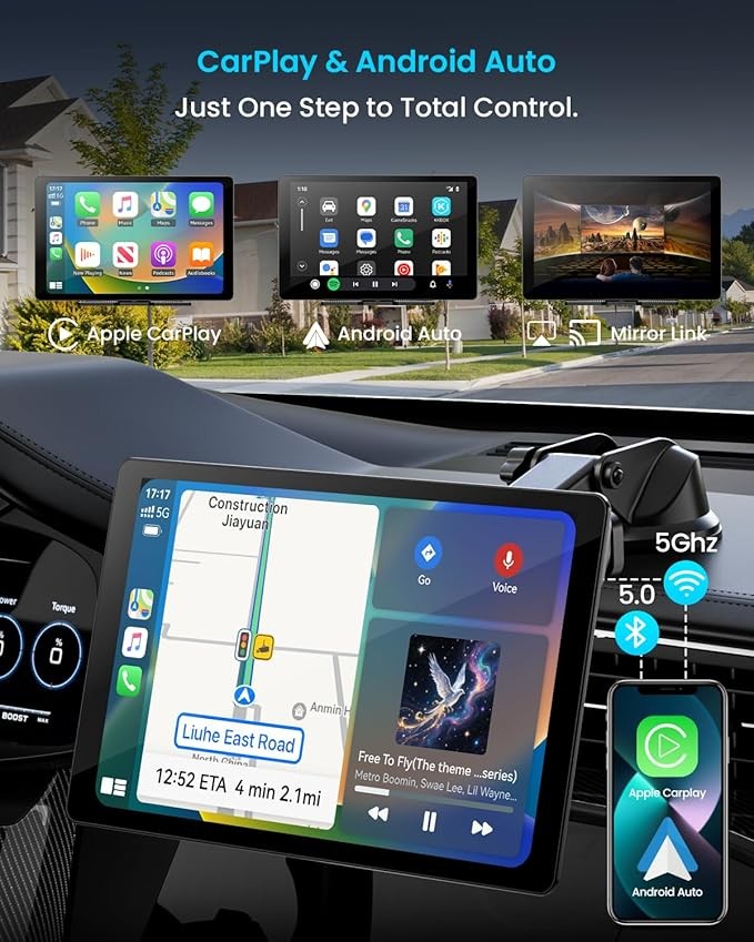 【 Easy Installation - Portable car stereo suitable for any vehicle Type 】 This wireless CarPlay screen is designed for universal installation and quick setup. No wiring required - Install using the included suction cup or adhesive. It is highly suitable for upgrading drivers using wireless Android Auto or portable CarPlay solutions.