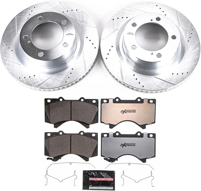 The Z36 truck and trailer front brake pad and rotor kit includes :2 front drilled and slotted brake rotors + 1 front Z36 carbon fiber ceramic brake pad set with hardware
