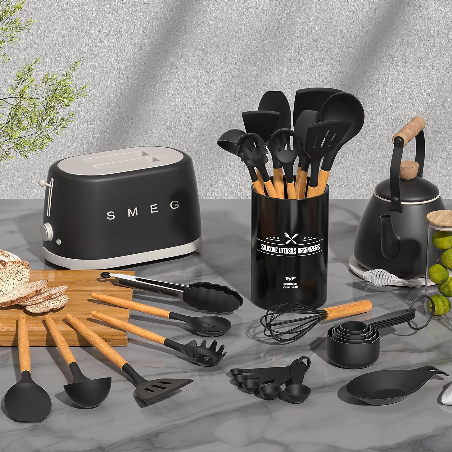 ✅33 DURABLE WOODEN HANDEL KITCHEN UTENSILS SET - Anti scalding protect your hand from burning, 33 professional silicon Kitchen utensil set includeshe set includes flexible spatula, soup ladle,serving spoons pasta server, spatula turner , tongs, mesuring cup and spoons, 10 hooks, silicone mat and so on. Meet your all kinds of kitchen needs, Because of the wooden handle, We don't recommend soaking in water for a long time or dishwasher cleaning
