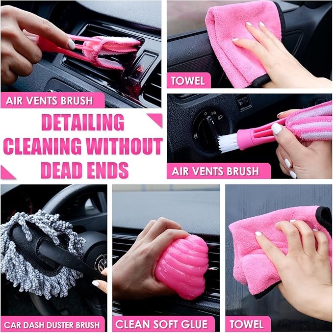 The pink car cleaning set includes :1 portable car vacuum cleaner, 2 car vacuum cleaners, 3 mini brushes, 5 detail brushes, 1 car windshield cleaner, 1 spray bottle, 1 coral velvet towel, 1 car dashboard dust brush, 1 air conditioning brush, and 1 Oxford storage bag. The perfect car cleaning kit inside enables you to clean your car conveniently at any time