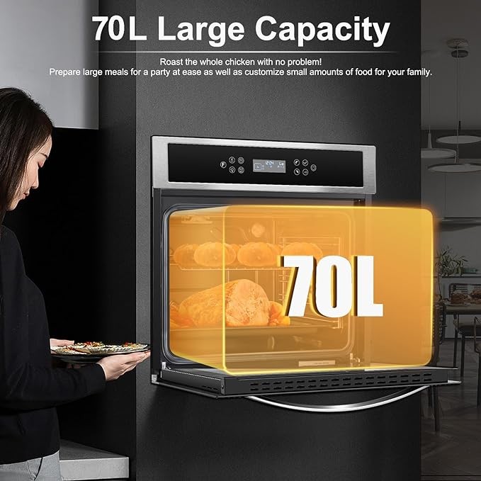 【Perfectly Fit Your Kitchen】 This 24 inch wall oven is with a product size of 23.4"x 22.24"x 23.4"(W*D*H) and a built-in size of 22.24"x 21.85"x 23.4"(W*D*H). With modern design, it match your kitchen perfectly. Compatible to install under any induction hob or gas cooktop.