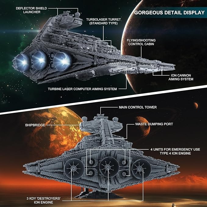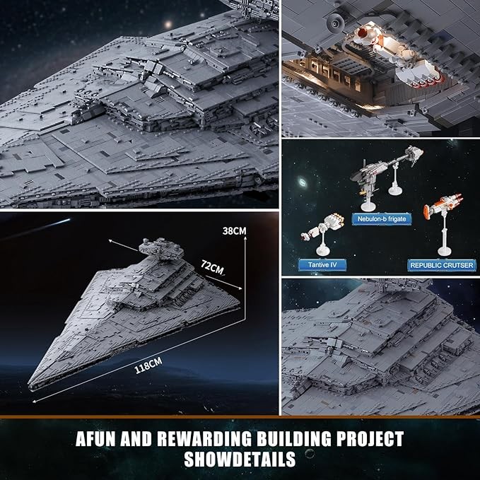 【Specifications】: Including 11885+ blocks of ABS plastic materials, made of blocks, finished size: about 46.4 inches (118 cm) x 28.3 inches (72 cm) x height 14.9 inches (38 cm), including parts: 5 small small sized Frigate, ion gun sighting system, turbine laser sight system, flight/shooting control compartment, turbine laser turret, shield launcher, main control tower, 3 "Destroyer 1" ion engine, 4 4 ion engines, ships, ships, ships, ships, ships Bridge and so on.